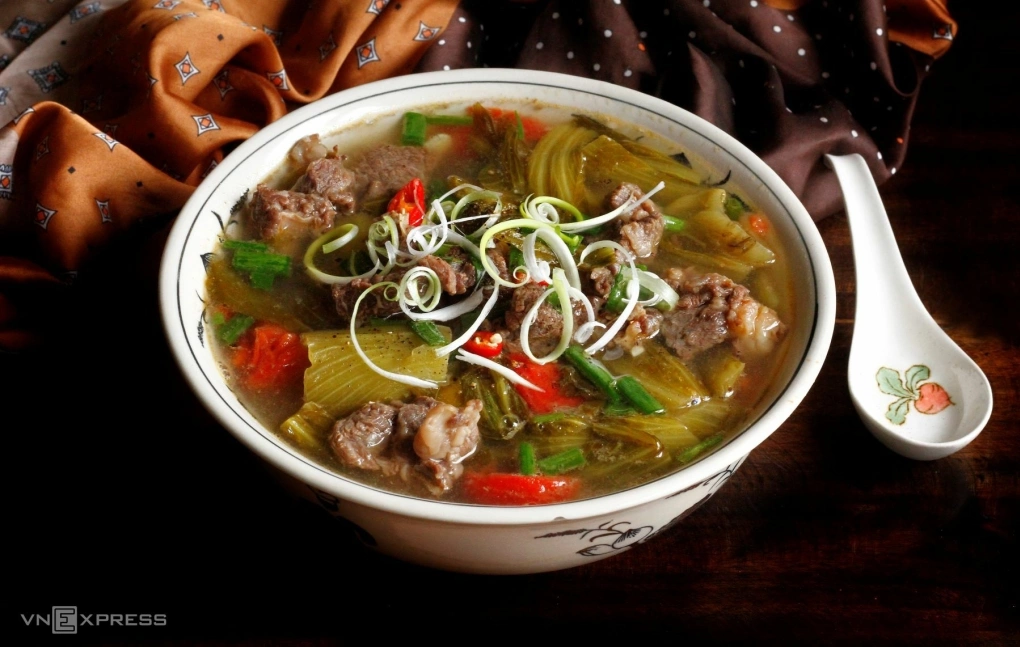 Bát canh nóng hổi, thịt bò mềm béo xen kẽ chút gân sần sật, dưa chua ngấu vị, nước canh chua thanh khá bắt vị. Đây là món ăn quốc dân vào mùa đông miền Bắc.